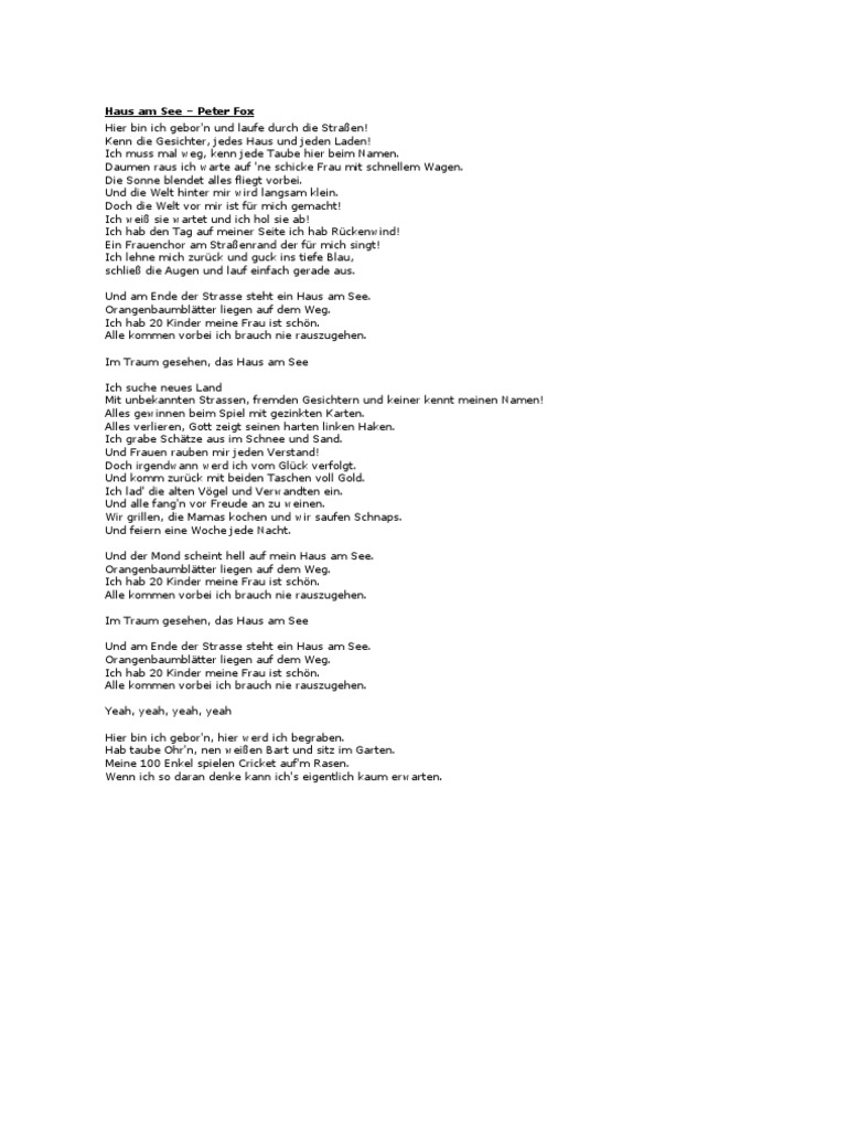 Peter Fox Haus Am See Lyrics Genius Lyrics from images.genius.com Wir bieten ihnen nicht nur eine gemütliche und komfortable unterkunft, sondern haben auch stets ein offenes ohr für ihre wünsche. Translation of 'haus am see' by peter fox (pierre baigorry) from german to english (version #2). Im reetdach ferienhausgebiet gelegen nur wenige gehminuten vom ostseestrand entfernt, ist dieses haus der ideale ausgangspunkt für ihren urlaub. Ein besonderer ort, innen wie außen: Peter fox haus am see mit text. Für nur 5 euro können sie eine halbe stunde lang den see erkunden. Haus am see (german for house on the lake) is a song released in 2008 by german musician peter fox. Pierre baigorry, david conen melodie: